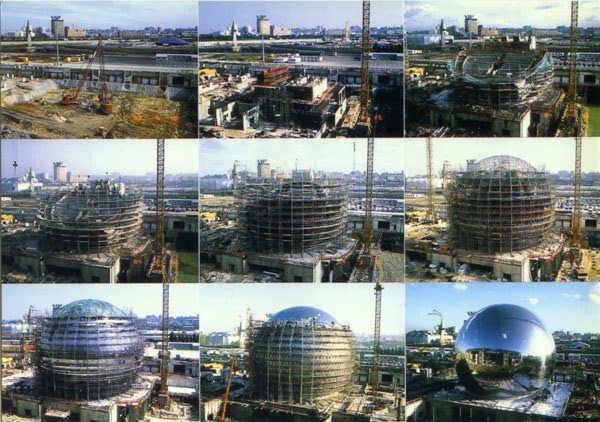 La Géode, de l'architecte A. Fainsilber, c'est 6400 triangles d'acier poli assemblés en une sphère de 36 mètres de diamètre accueillant un écran hémisphérique de 1000 m2.